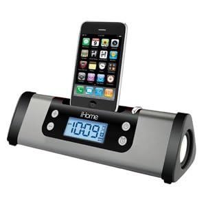There are several companies making alarm clock/speaker docks for the Apple iPod/iPhone lines. I have two, the XtremeMac Luna Voyager and this iHome iP16GXC. Both provide a docking port for the iPod/iPhone on the top panel. Both then sync with the device so as to display the time. The XtremeMac, which is just a few dollars less expensive than the iHome model, has a blue florescent digit display for the clock while the iHome has a backlit LCD display. While the XtremeMac looks cooler, the iHome is actually more legible from a distance and easier to read at a glance.